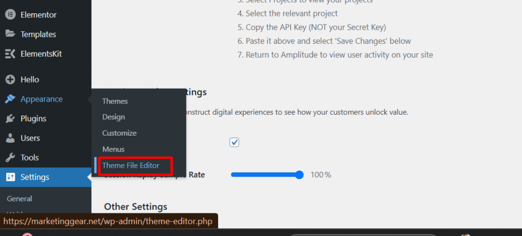 - From the left-hand menu, navigate to Appearance > Theme File Editor.