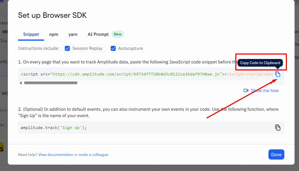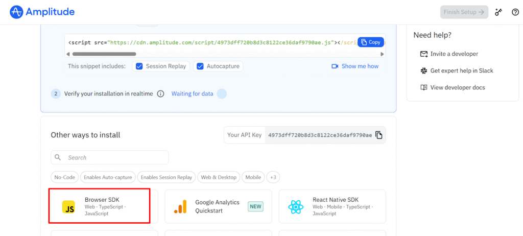 - Amplitude will now generate and display a JavaScript code snippet. This block of code is unique to your project and already includes your specific API Key.