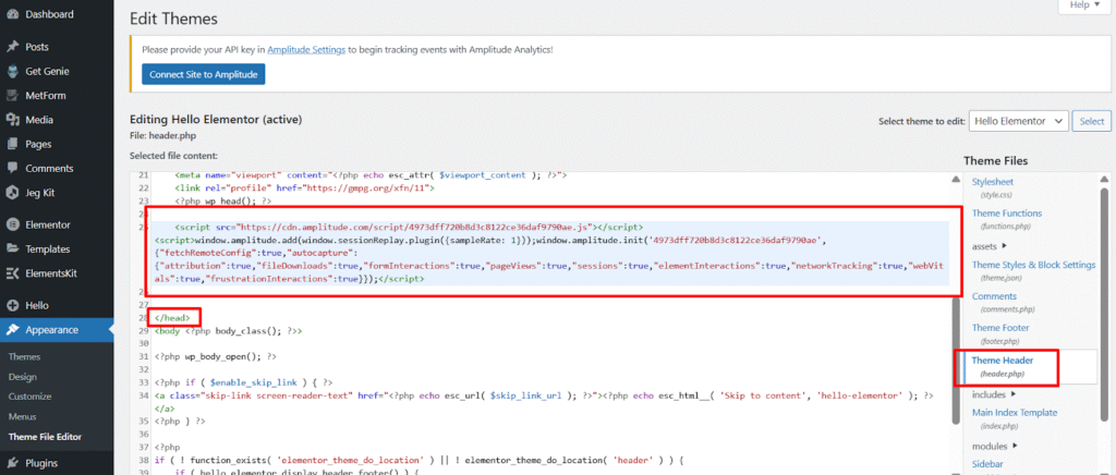 - Paste the Code: Paste the full Amplitude code snippet just before the closing </head> tag.
