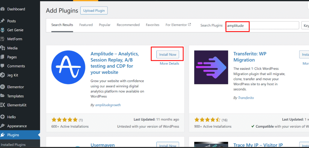 - Install the Plugin: In your WordPress dashboard, go to Plugins > Add New. Search for “Amplitude Analytics“. Install and activate the official plugin by Amplitude.