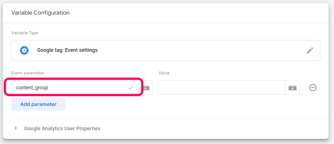 We will then add content_group as the name of the parameter. This is the exact name that must be added as it is the predefined parameter for content groups in GA4. Any other name will have to be registered as a custom dimension.