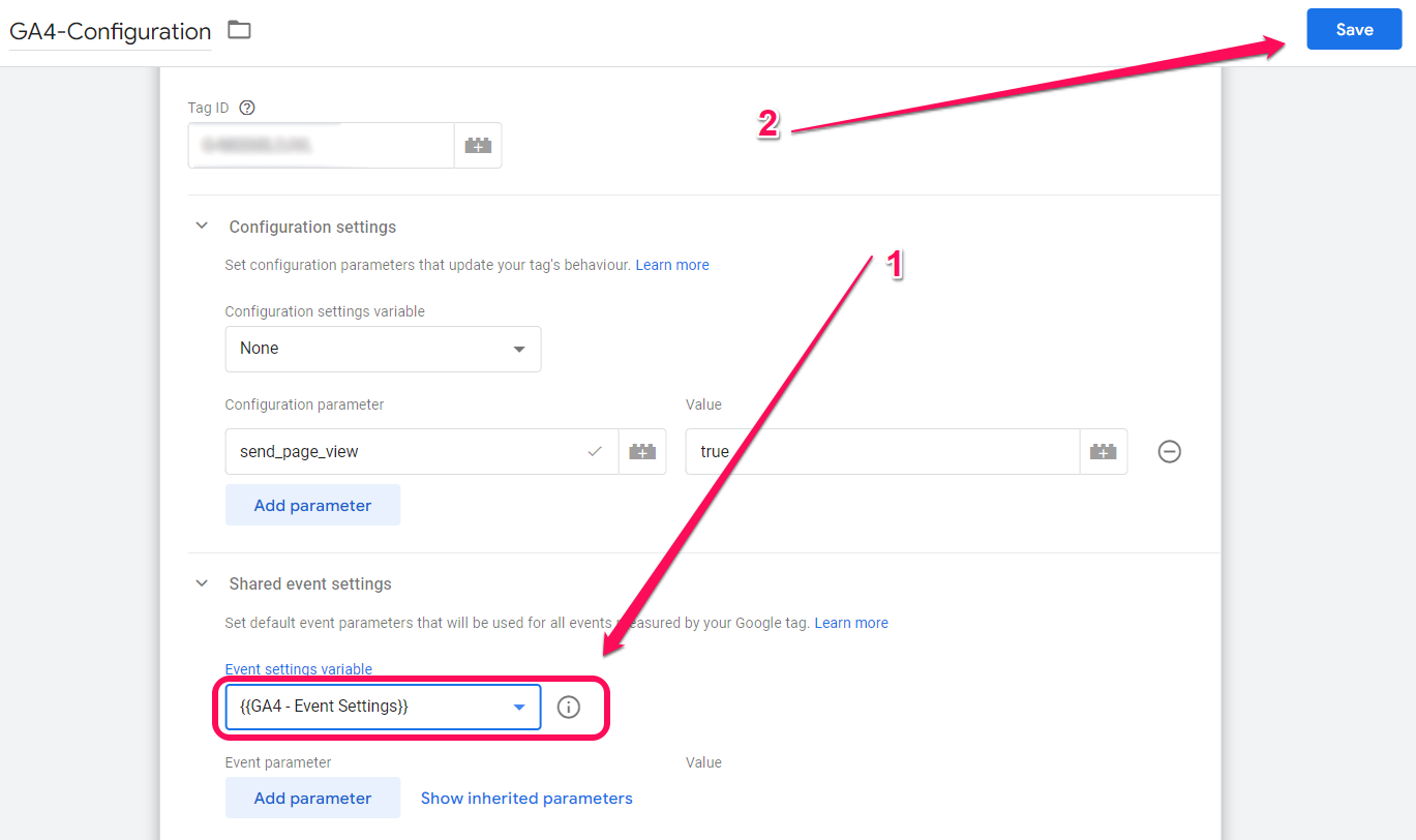 We will then edit the GA4 configuration tag by going to the shared event settings section and selecting the variable of the parameter that we have just created (GA4 – Event Settings). We will then click to save the update.