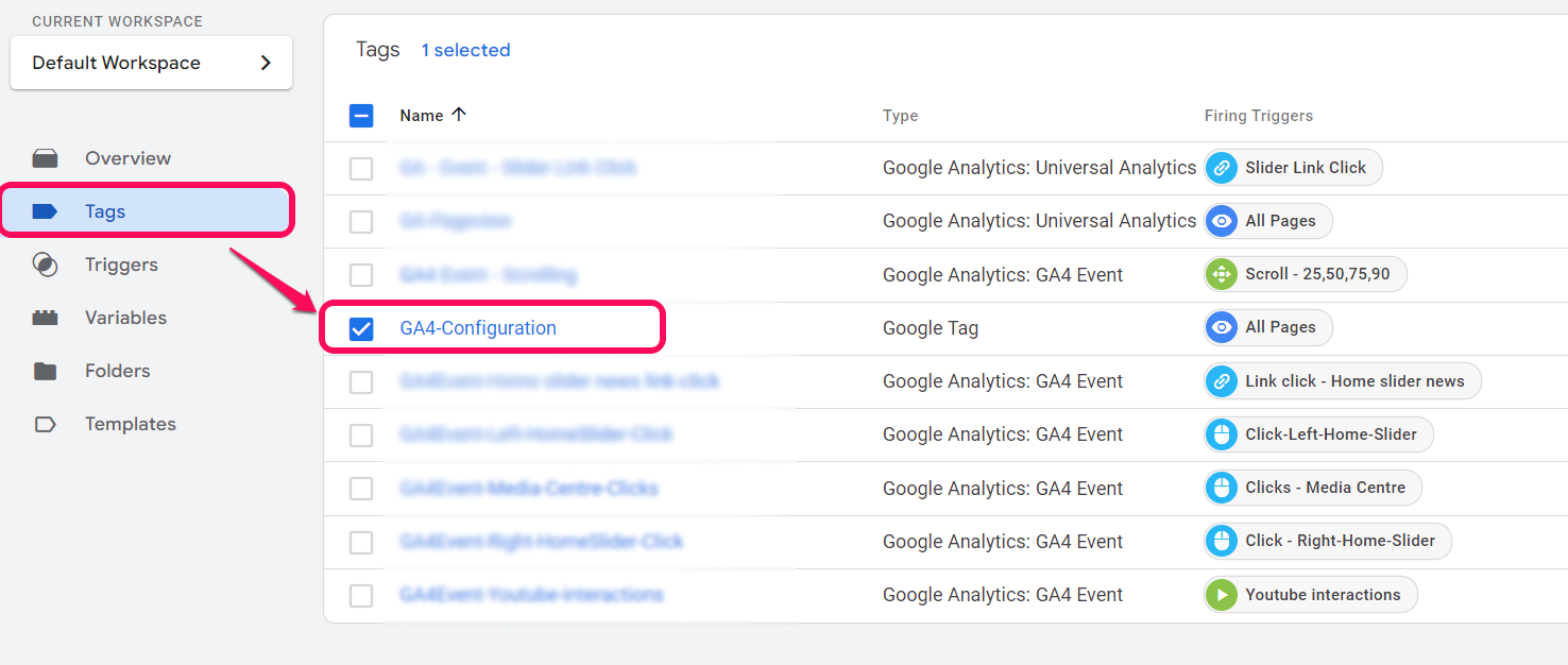 Back in the google tag manager workspace, we will click on the tags section on the left side and select the GA4 configuration tag.