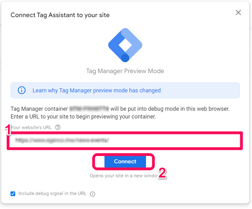 Back in our GTM workspace, we will click the preview button and connect to the tag assistant to debug our setup of the content group.