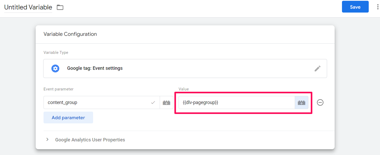 In the parameter value to the right, we will need to enter a variable that returns the name of the content group that we are creating.