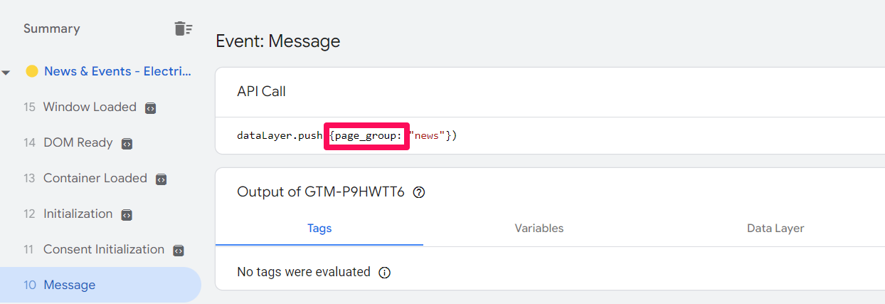 A Message event appears on the left side of the screen showing that the datalayer.push was successful. Once clicked on, the output section on the right gives more details about the contents of the datalayer.
