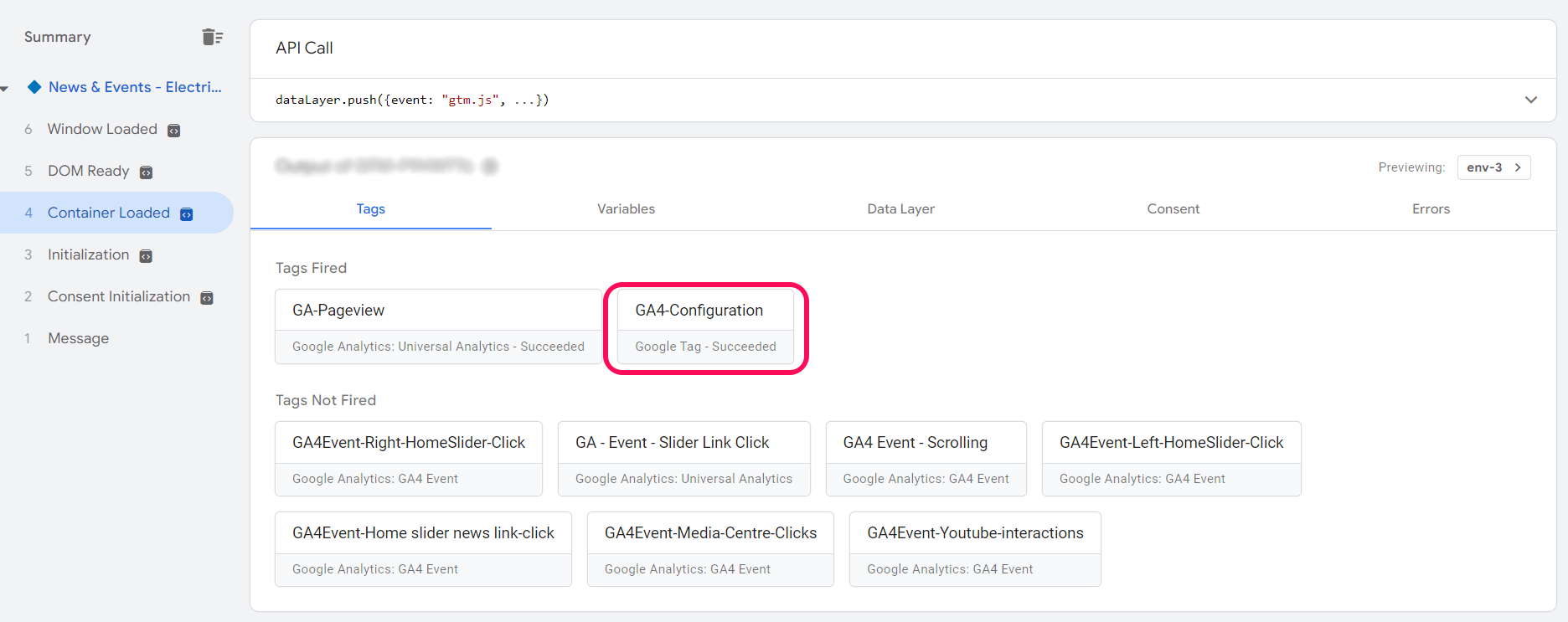 The usual debug interface will appear showing various tags, fired or not. We will click the GA4 configuration tag.
