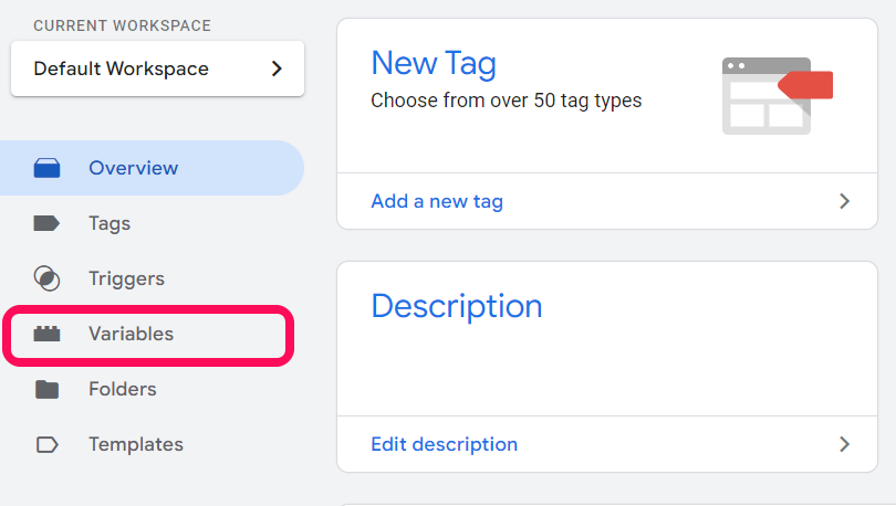 Back in our google tag manager workspace, we will click the variables menu on the left side.