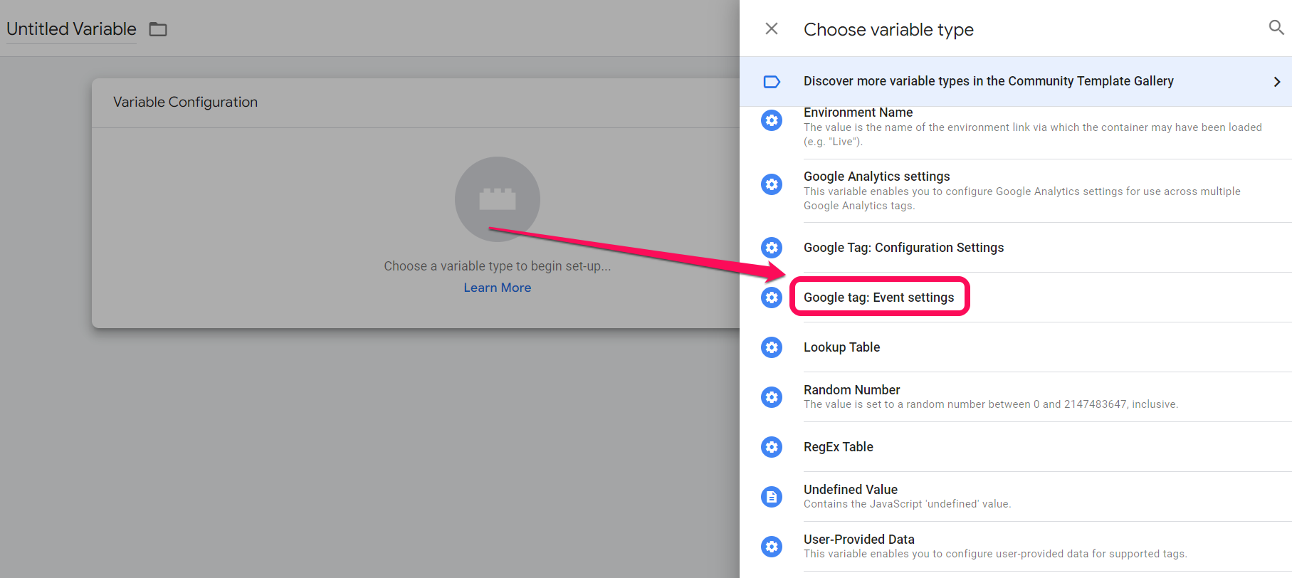 In the variable configuration section, we will select the Google tag: Event settings variable type.