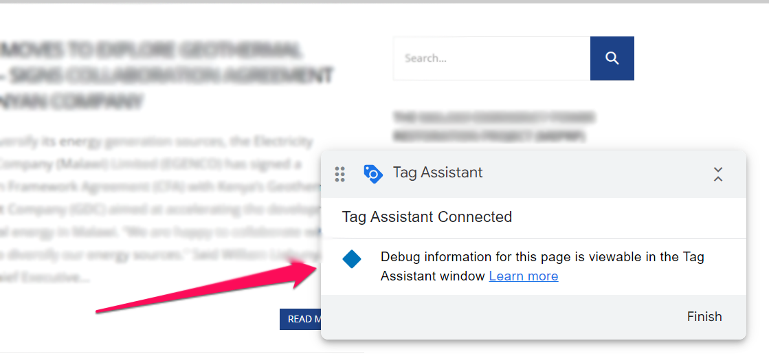 - A new browser window opens with the preview of the website page or section of which we are setting the content group – the google tag assistant at the bottom right corner shows that the connection is successful.