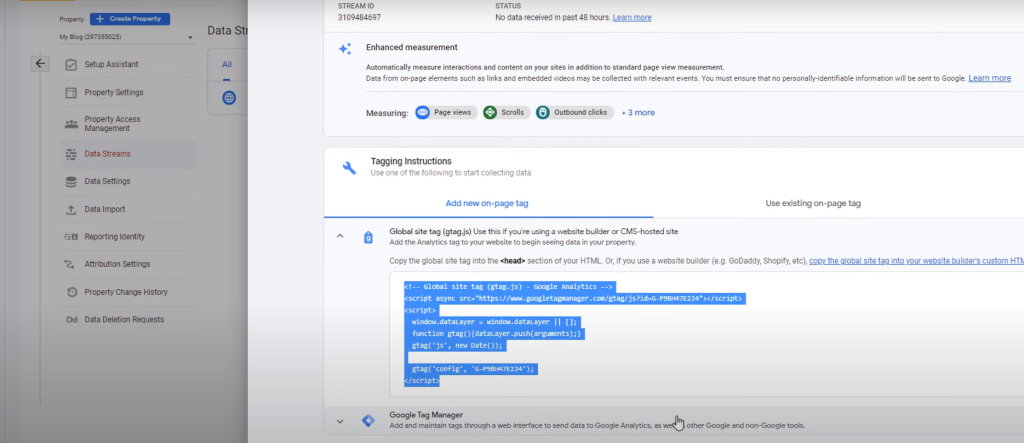 To get the code implemented in Blogger again. Go to the admin panel, go to the data streams, click on the data stream and click on the global site tag. This is where to get that code again. However, if an existing Google Analytics account (Universal Analytics), also known as GA3, is already available. Then follow the same process in Blogger; however, the code will look different and available in another place.