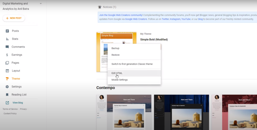Head over to Blogger. If it has multiple blogs, make sure to select the right blog. Go to the theme you have chosen and click the button named customize. Click on the drop-down and click on edit HTML. It allows editing HTML. Find the head tag and paste Google Analytics code within the head tag. Now the Google Analytics account is ready to collect the data.