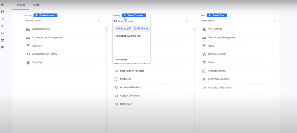 Go back to the admin panel and click on admin. So if the existing account has Universal Analytics installed already, it is identified by UA code. Google Analytics4 account does not have a UA in front of it, and that’s the way to differentiate. Universal Analytics account also has a view panel, while Google Analytics4 does not have a view panel. So that’s a significant difference. Now in Universal Analytics property, click on tracking info and tracking c7de. This is the code that has to be copied and pasted in Blogger at the same place.