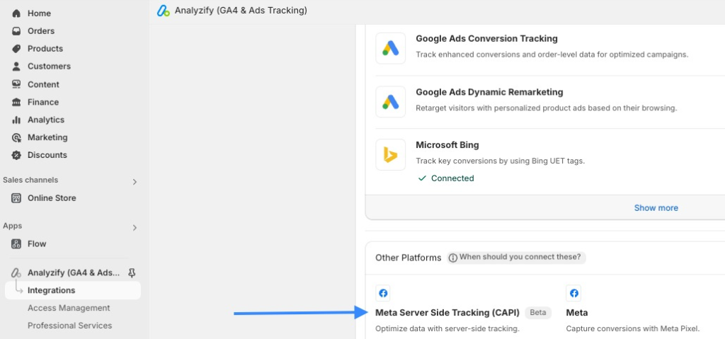 1. Go to Analyzify → Integrations → Meta Server-Side Tracking (CAPI)
