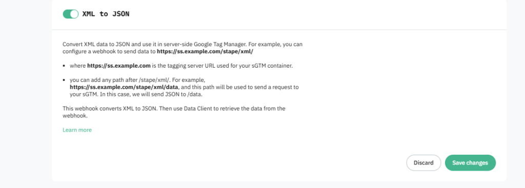 Once activated, Stape will automatically convert incoming XML webhook payloads into JSON format before processing them in your server container.