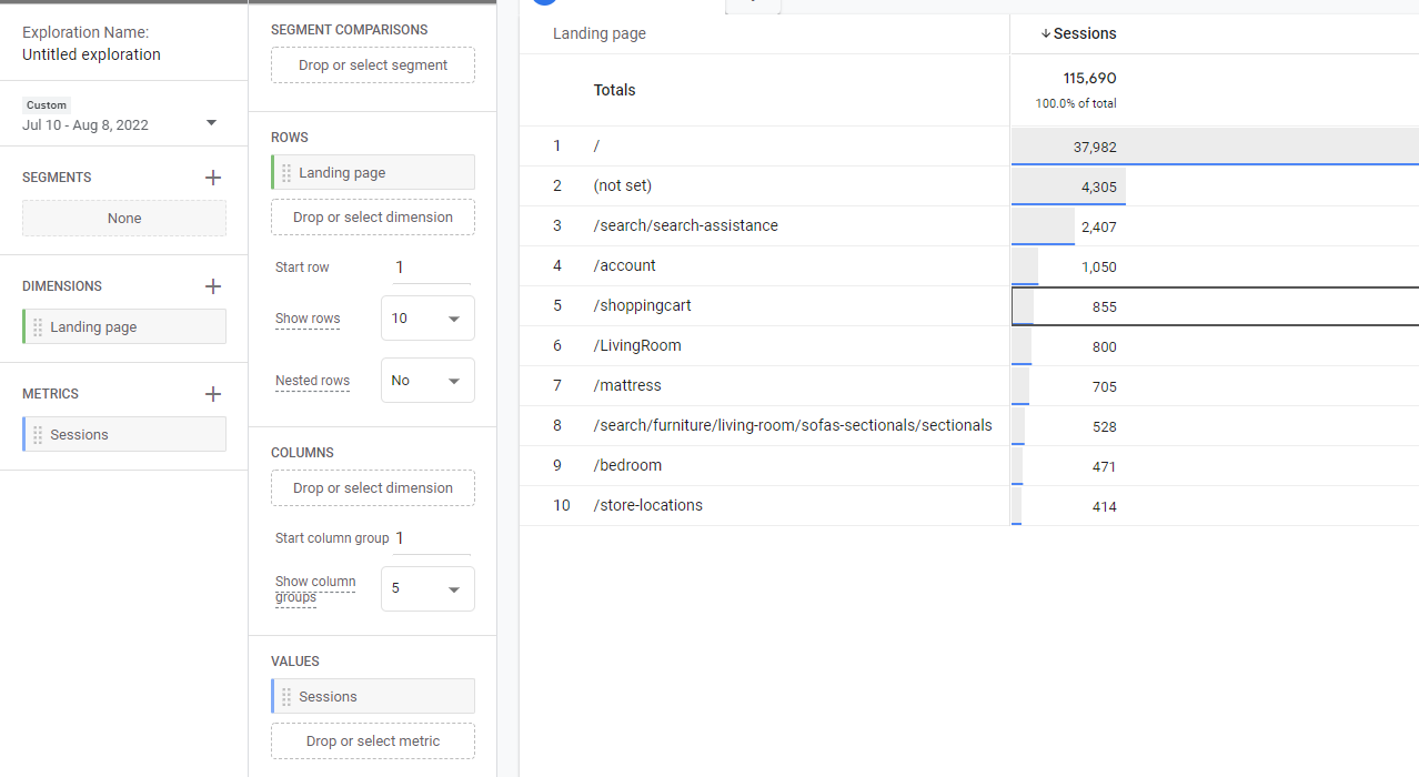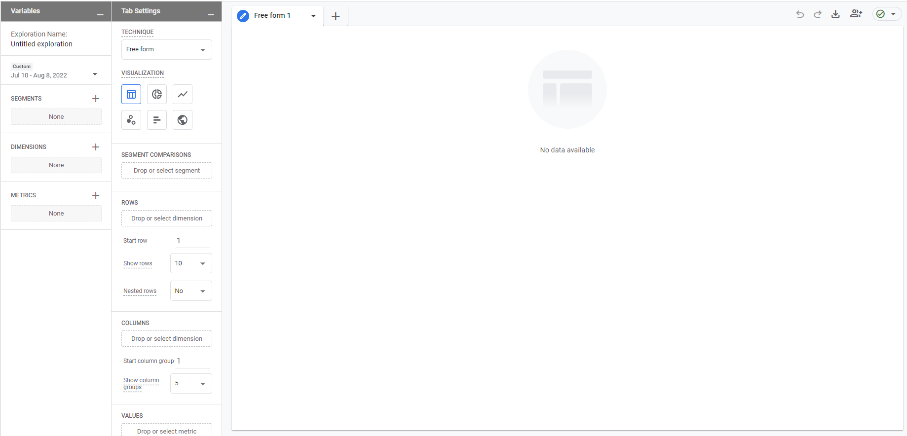 Blank exploration provides you with an empty canvas or template that you can build any way you like. The blank exploration defaults to a free from type, which means you will see you data in rows and columns, as you are used to seeing in Universal Analytics.