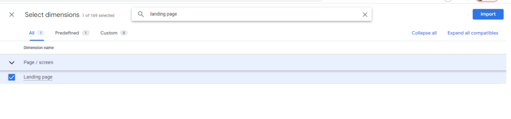 Click on the "+" sign next to the "Dimension" in the left-hand pane. This will open up a list of dimensions that you can use for your report. Search for "Landing Page", select the check box next to it and click on the "Import" button on the top right corner.