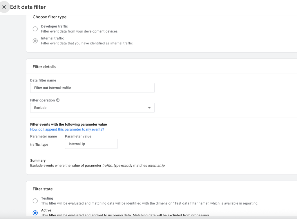 Note – Make sure the traffic_type value in the Data Filter matches exactly the value you defined in Step 1 (Define Internal Traffic)—for example, if you used “Filter out internal traffic” there, use the same value in the filter so GA4 can correctly identify and exclude that traffic.