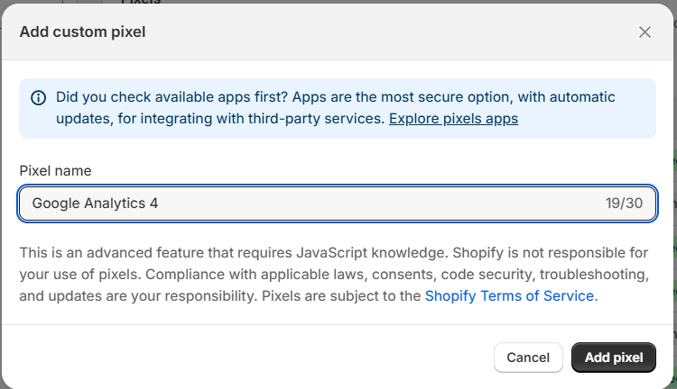 This guide walks you through setting up GA4 on Shopify using a custom pixel.