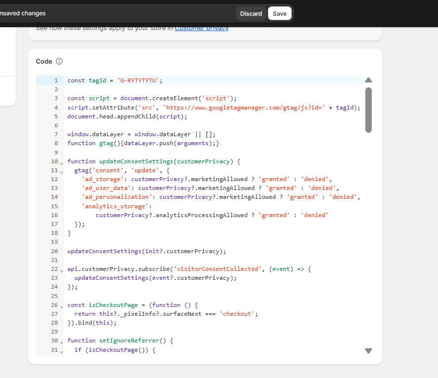 - Replace the tagId value in the code with your GA4 Measurement ID (e.g., G-XXXXXXXXXX).