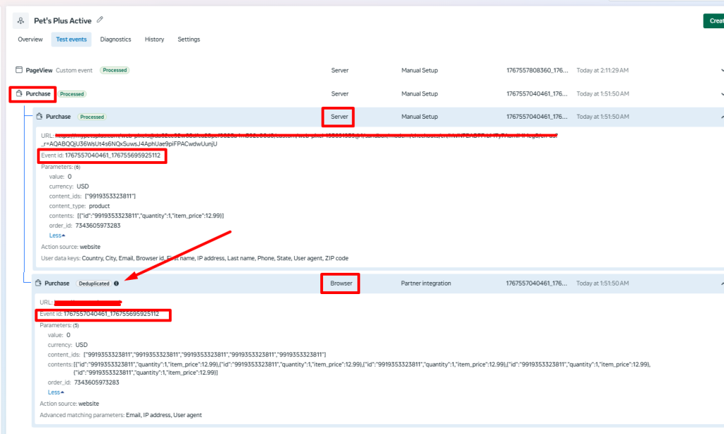 Now both the Meta Pixel and Conversions API are sending the same event_id, enabling Meta to deduplicate events automatically.