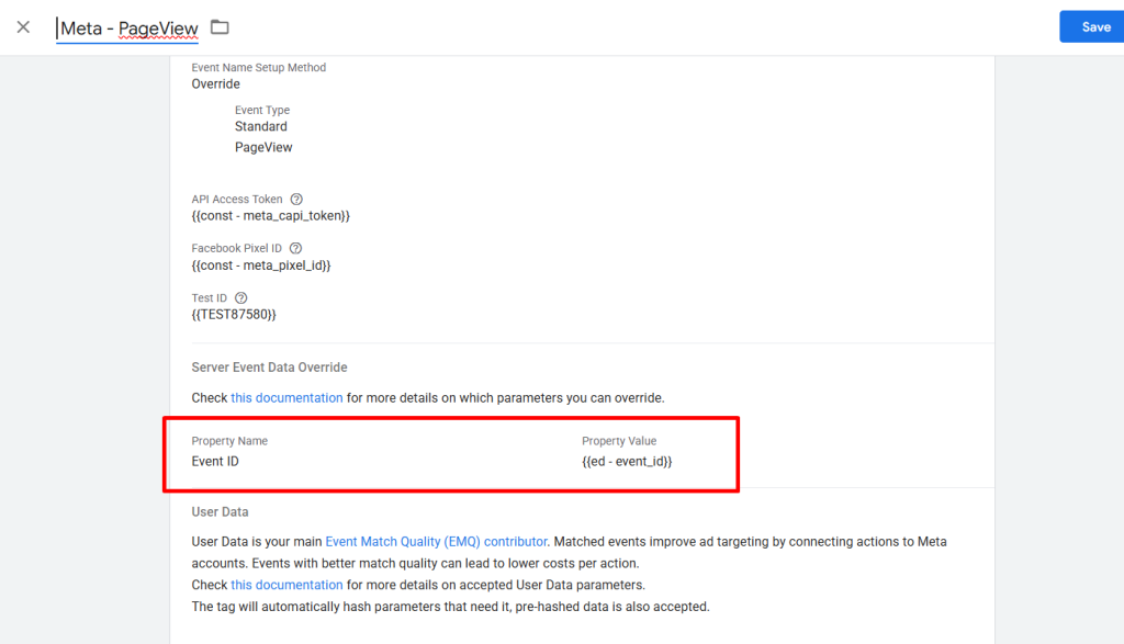 fbq(‘track’, ‘PageView’, {}, { eventID: ‘{{Unique Event ID}}’ });