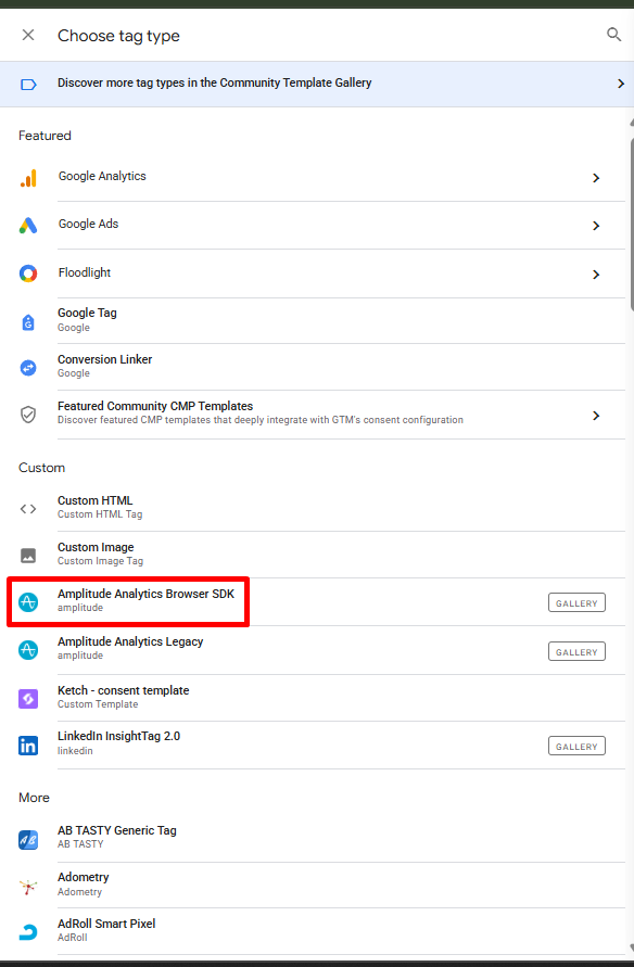 - Navigate to the Template Gallery and search for the Amplitude Browser SDK or the relevant Amplitude tag template.