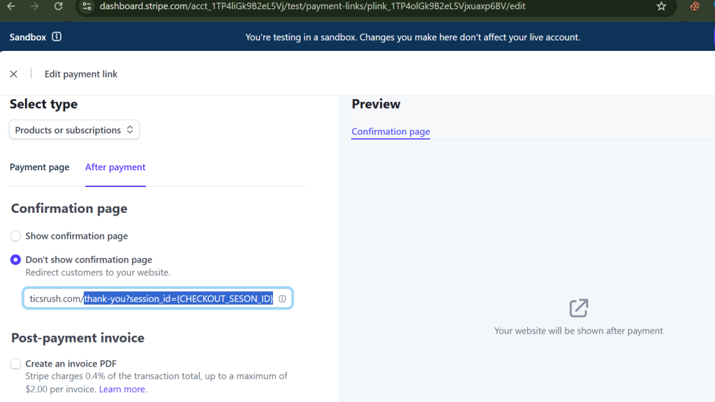 success_url: ‘https://yourdomain.com/thank-you?session_id={CHECKOUT_SESSION_ID}’