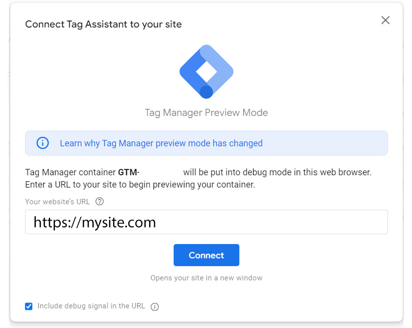 Google Tag Manager will prompt you to enter your web address and connect to Tag Assistant
