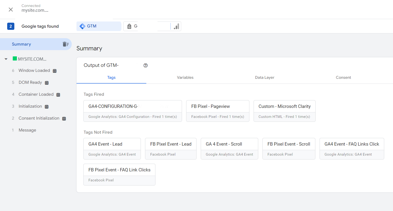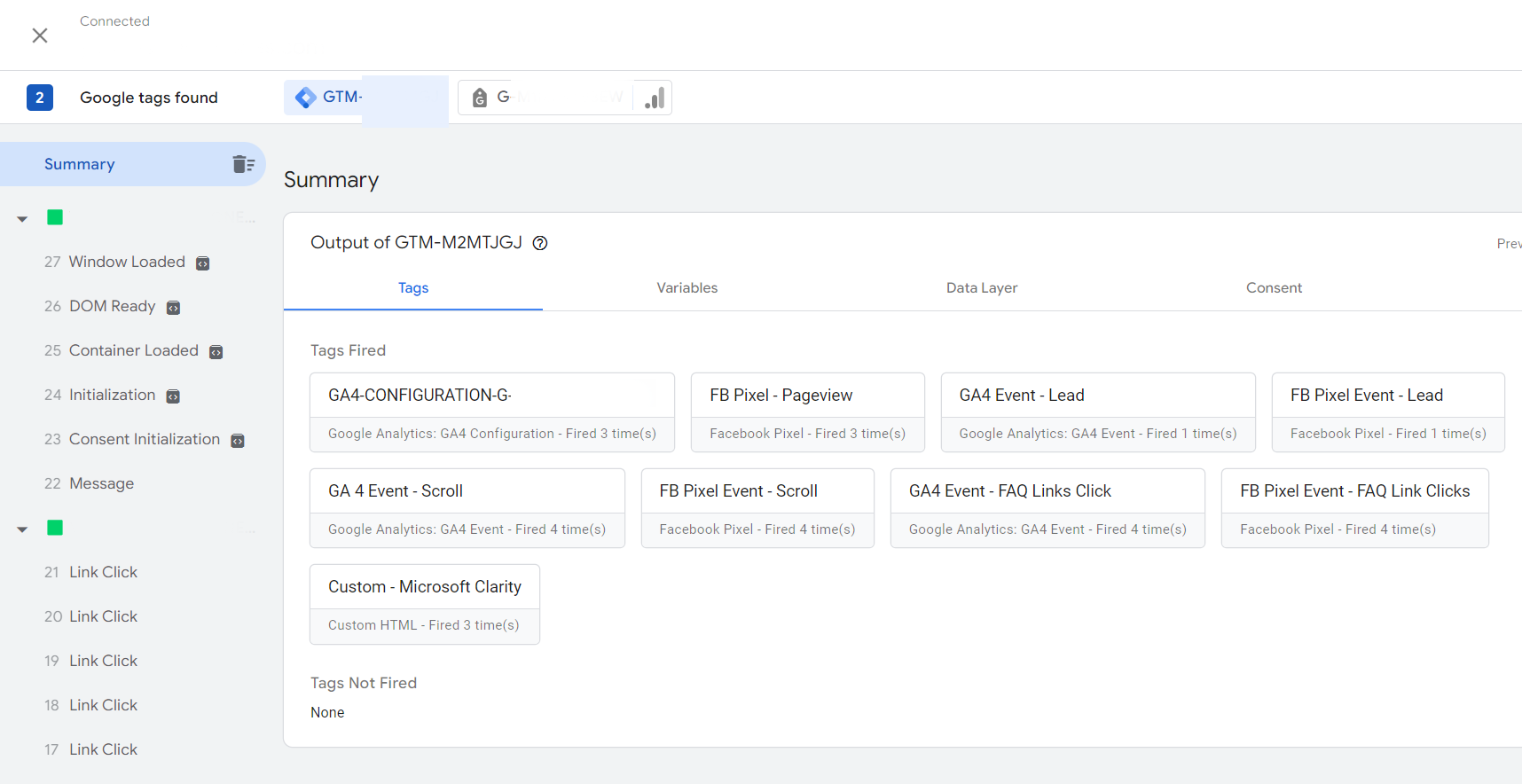Once you click around and interact with your website in the preview window in tag assistant, the debug interface will update information about the tags that are firing from your website.